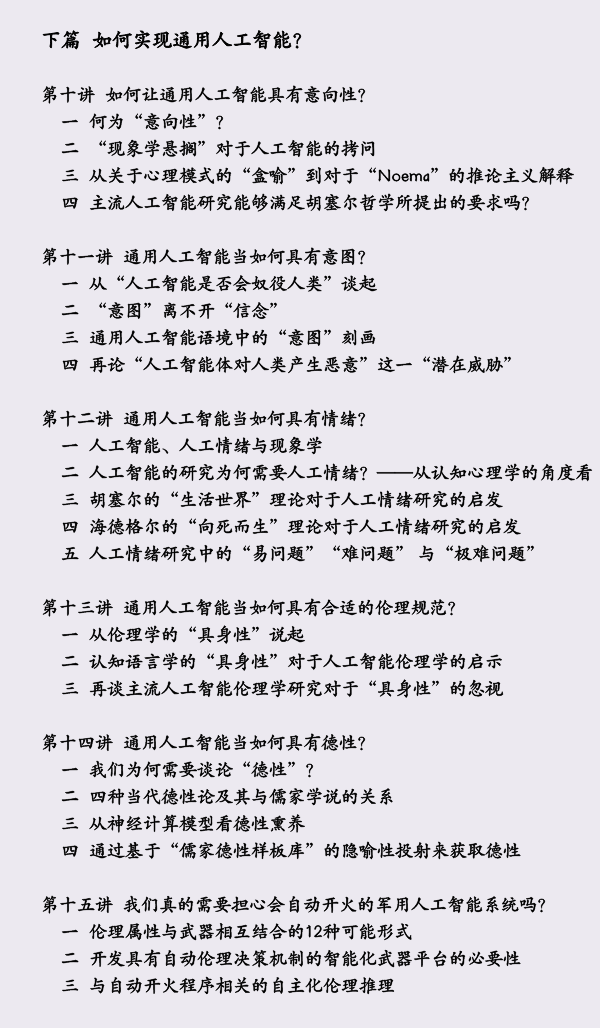 不过,读者能够读到笔者的这些忧虑,至少说明这本书已经得到了出版。在此,我首先要感谢北京大学出版社的田炜女士在促成本书出版的过程中付出的努力。早在2018年我在北京主持“世界哲学大会人工智能分会场”的工作时,她其实就向我约了稿,但因为稿约繁忙,直到2020年6月底我才交稿,甚为惭愧。在此我还要感谢中国工程院院士李德毅教授在阅读本书一些章节的初稿时对笔者的鼓励与批评意见。需要指出的是,本书的很多思想,来自笔者长期与美国天普大学的计算机专家王培老师学术交流的结果,因此,没有他的思想刺激,这本书也不可能完成。同时需要指出的是,我已故的导师俞吾金先生在生前一直嘱咐我要做分析与欧陆哲学兼通的学者,而本书对于各种相关思想资源的调用,也正是为了实践我导师生前的治学理念。