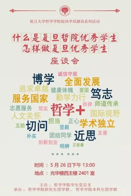 5月26日,为迎接复旦大学建校112周年,进一步加强校风学风建设,复旦大学哲学学院学生党总支举办校风学风建设系列活动之“什么是复旦哲院优秀学生,怎样做复旦优秀学生”主题座谈会,开展了一场别开生面的优秀学生标准大讨论。本场活动由哲学学院学生党总支主办,哲学学院研究生团学联、哲学学院本科生团学联合承办。哲学学院副院长林晖老师,哲学学院党委副书记、学生党总支书记盛情老师,学生党总支委员和学院本、硕、博的学生代表二十余人共同参与了活动,所有与会的同学都参与了讨论。