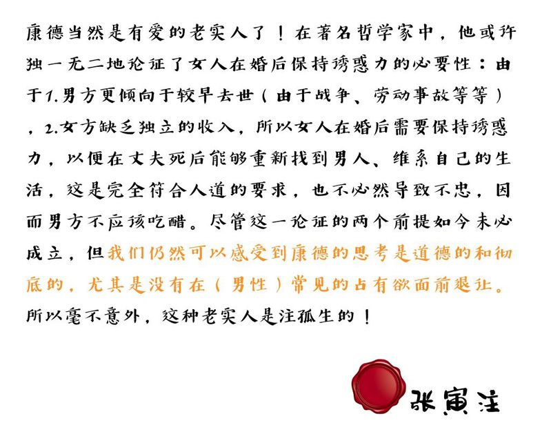 德国人传统生活理想是:买一栋房,种几棵树,养一只狗,结一次婚,生一堆孩子。康德一辈子只办到了一点:63岁的时候,他买了一栋楼。