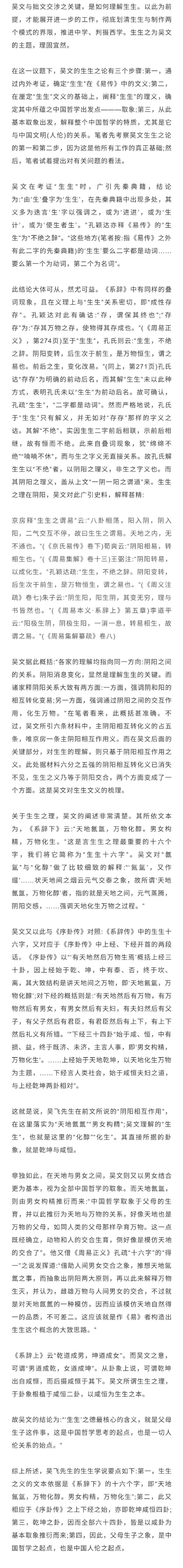 吴飞先生的《论“生生”》是近期一篇重要的中国哲学文献。文章从现代中国思想的历史处境出发,梳理和辨析了对生生之道的几种阐释理式,进一步提出了关于自然与人伦关系的基本主张。吴文考据周详、论证缜密、视野开阔、辨析入微,且显然具有更为完整的意图,本来非笔者所应置喙。由于文章在论题与理路上均直接涉及几年前已发表的拙作《生生与造作———论哲学在中国思想中重新开始的可能性》,而近来自己也试图推进有关思考,故不揣冒昧,撰文回应。因篇幅有限、时间仓促,于西学部分只做两点申辩:第一,吴飞先生以形质论判断西方哲学的基本传统,自有其合理之处。但在亚里士多德及其统绪中,目的论主导形质论,而非相反。目的论确有超越形质论之努力与效验;第二,吴飞先生对中西学关系的看法与笔者大本不异,而态度略有不同。吴飞先生主判析,欲划清一切界限;笔者主判摄,欲划清界限之后收摄西学,依中学阐释而安顿之。唯此两点所涉颇大,尚需论证,且待来日。下文仅就生生问题略申己见。