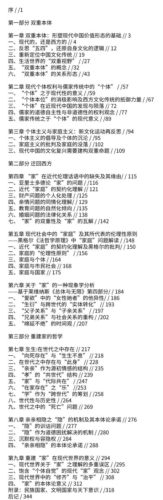 书中也附录了一篇关于“国家”的文章:“民族国家、文明国家与天下意识”(《争鸣与探索》,2014年9月),这应该也是上一个版本著作中的某个章节。现在的篇幅则主要集中在“家”的问题上,故取名《论家:个体与亲亲》,既聚焦在“家”的问题上,也显示了“个体”与“亲亲”的双重视野。