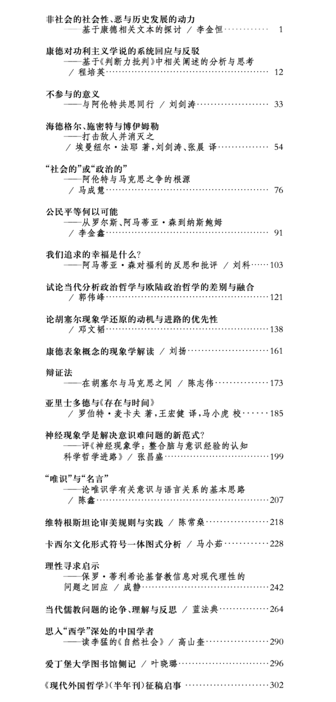 本辑《现代外国哲学》收录的稿件大致包括四个方面的内容:(1)政治哲学和伦理学,(2)现象学和诠释学,(3)审美与文化研究,(4)书评与访学侧记。我们按照这一秩序编排目录。其中,政治哲学和伦理学的文章的论题较为集中,主要讨论公平正义问题,并联系到人性、人的能力及社会制度。我们把两篇有关康德的文章放在前面,不仅仅因为时间上的顺序,而且也考虑到学理上的贯通。在中国学界,习惯于把黑格尔以后的西方哲学称为“现代西方哲学”。确实,黑格尔是欧洲近代体系哲学的巅峰,黑格尔以后的西方哲学呈现转向性的变化,如“实证的转向”“语言学的转向”“现象学的转向”等。然而,这些转向大多着眼于认识论和方法论;从政治哲学、历史哲学和伦理学的角度看,变化则没有那么明显。我们今天讲述分析哲学,从弗雷格、罗素和维特根斯坦谈起;讲述现象学和诠释学,从胡塞尔、狄尔泰和海德格尔谈起;讲述结构主义和后结构主义,从索绪尔和列维-斯特劳斯谈起。但是谈当代的政治哲学和伦理学,则很难绕开霍布斯、康德和黑格尔等近代哲学家。罗尔斯的《正义论》、汉娜•阿伦特的《反抗“平庸之恶”》、阿马蒂亚•森的《正义的理念》、纳斯鲍姆的《寻求有尊严的生活——正义的能力理论》等当代反响强烈的政治哲学和伦理学的论著,都是从评述康德等近代哲学家有关政治和伦理的观念入手的。本辑把有关阿伦特、阿马蒂亚•森和纳斯鲍姆的论政治哲学和伦理学的文章放在康德的相关文章之后,可以看到这些哲学家之间思想上的脉络关系。这从一个侧面反映,当今社会的历史依然是启蒙运动以来现代化进程的一部分,所谓“后现代主义”并不意味现代社会进入了一个新的历史阶段,而是对现代化过程中出现的问题进行哲学的反思。