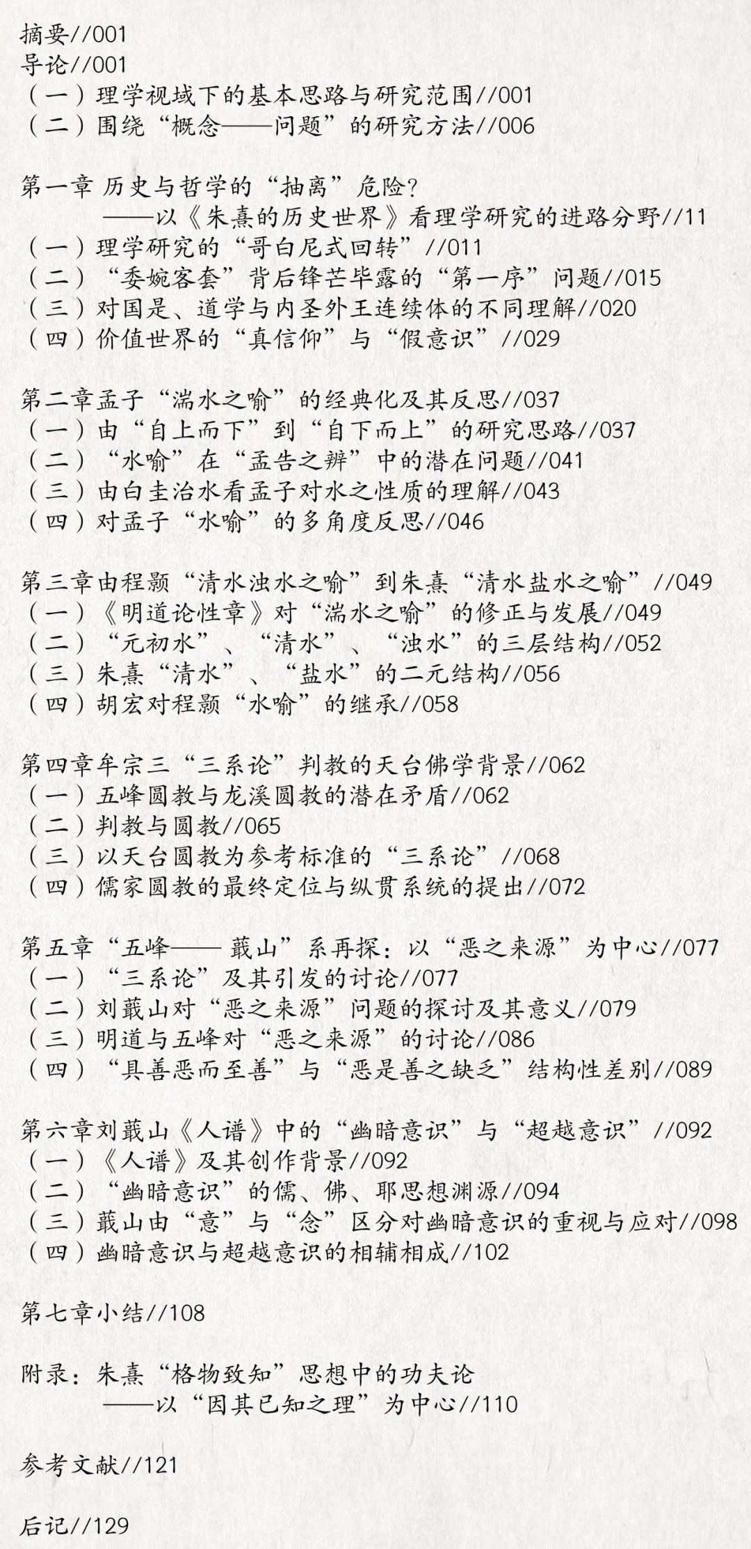 导论部分交待基本思路和问题意识之后,第一章以《朱熹的历史世界》为引子,指出哲学史研究和思想史研究范式上的差异。所谓哲学的“二度抽离”不仅必要,而且可以为其他范式的研究提供基础。第二章和第三章具体以孟子“湍水之喻”作为切入点,认为它存在着若干问题。宋代儒学对诸如天地之性与气质之性做具体区分后,经过程颢、朱熹以及胡宏的多次修正,“湍水之喻”的喻体有一个从“水之就下”,到“水之清浊”,再到“清水盐水”的变化。这一过程正是宋代理学从自身的学说出发,通过微调“湍水之喻”的喻体,进而对孟子性善论进行补充和修正的过程。在这一系列植根于经典的不断创新中,我们可以发现儒家性善论可以有诸多不同的发展向度,而“湍水之喻”的变迁正是儒学在融合与创新中不断丰富自身内涵的一个缩影,而以“湍水之喻”为切入点,我们还可以看到反而是被朱熹所批评的胡宏在理论范式上更接近于程颢。