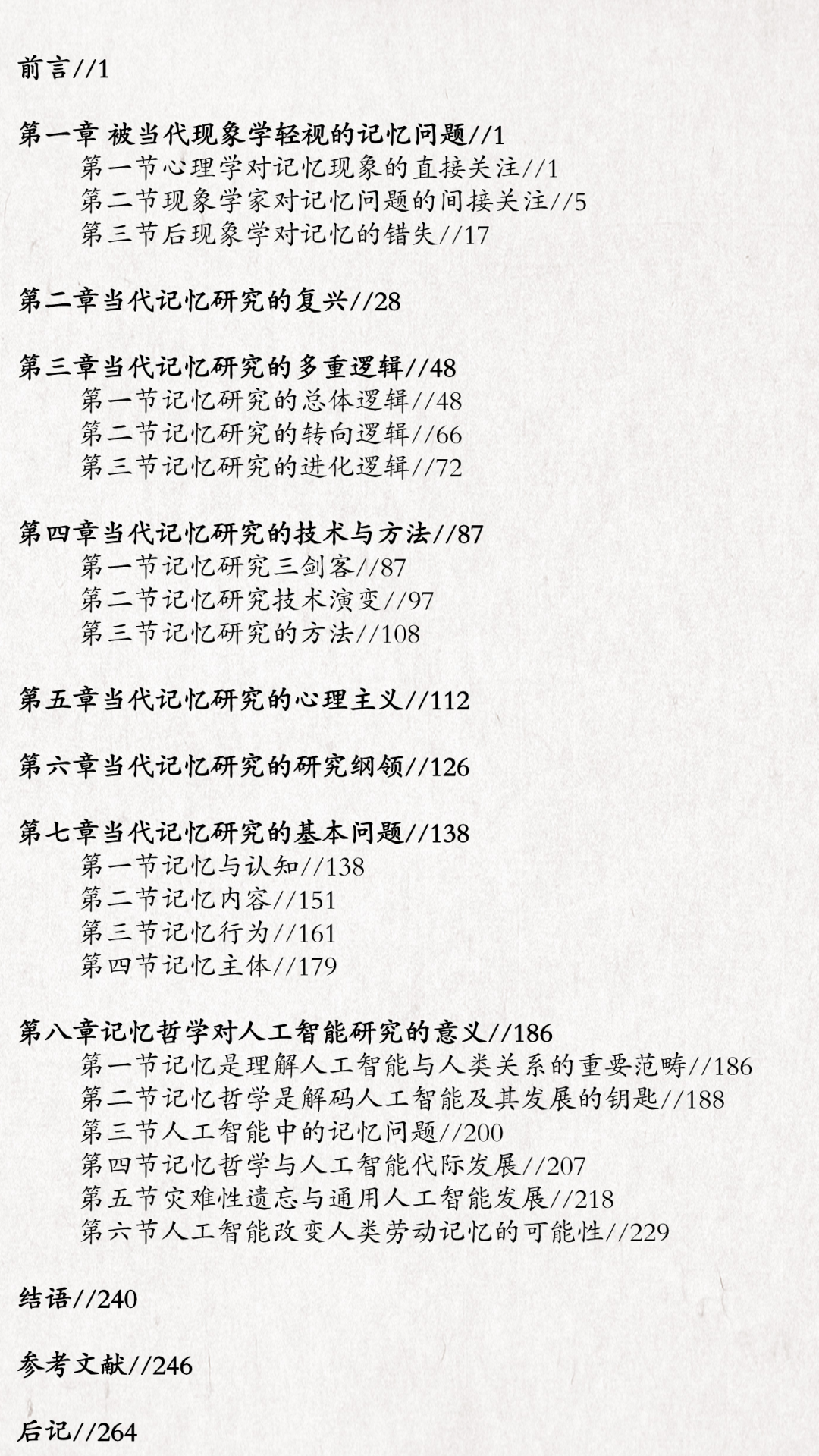 本著作即是如此,试图通过对20世纪60年代以来的记忆科学研究成果进行哲学阐释,继而实现两个密切相关的目的,其一是为当代记忆哲学复兴提供科学路径的支持;其二是为若干哲学问题的解决提供记忆方案。其中,科学路径与哲学路径形成了两条共同的有益于记忆哲学复兴和发展的路径。甚至深入分析科学路径反而更加有助于这一任务的实现。因此,本著作概括1960年代以来记忆研究的整体状况、多重逻辑、技术方法、研究纲领,并进一步分析了记忆研究中的基本问题,并在此基础上反思记忆研究对于理解人工智能发展的诸多意义。