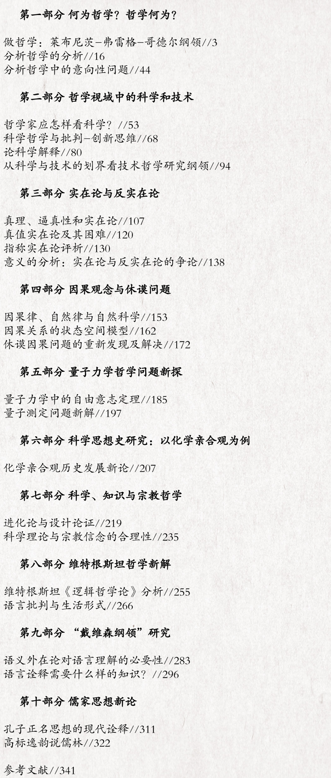 上述求学激情和研究取向一直激励着我不断“在哲学之路上求索”,而这里选编的文集则力图反映我在求索之路上留下的一些印迹。文集中25篇论文的主要内容被分为十个主题(参见目录)。其中,第一、二两篇论文主要是对元哲学问题(哲学观)的探索,强调“做哲学”的一种研究纲领——“莱布尼茨-弗雷格-哥德尔纲领”,提示了我对分析哲学的总体看法。可以说,这两篇论文对全书具有统摄之力,或者说其余论文均可视为针对特定问题而尝试“做哲学”的具体体现。在“做哲学”所突显的以问题为导向的研究风格引领下,文集中的问题所涉哲学领域关乎形而上学、知识论、科学哲学、语言哲学、宗教哲学,以及在哲学视域中对科学思想史和中国思想的探索。