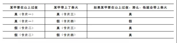 假设你是一个阿尔卑斯登山俱乐部的成员,而你的任务是检测俱乐部的下述规矩是否已经得到了所有人的遵守:“如果任何一个俱乐部成员要在山上过夜的话,那么,他就得随身带上过夜的柴火 (以防止后来的俱乐部成员无柴可用)”。实验者将 “在山上过夜为真”写在 “卡片一”上,将 “在山上过夜为假”写在“卡片二”上,将 “带柴火上山为真”写在 “卡片三”上,并将 “带柴火上山为假”写在 “卡片四”上。尔后,实验者再将这些卡片写字面朝外,两两粘贴在一起 (其中,两张卡片的黏结表示了前件与后件的联接),并将其中的一面朝上放置于桌面上。从命题逻辑的角度来看,这四面卡片之间的真值关系如下: