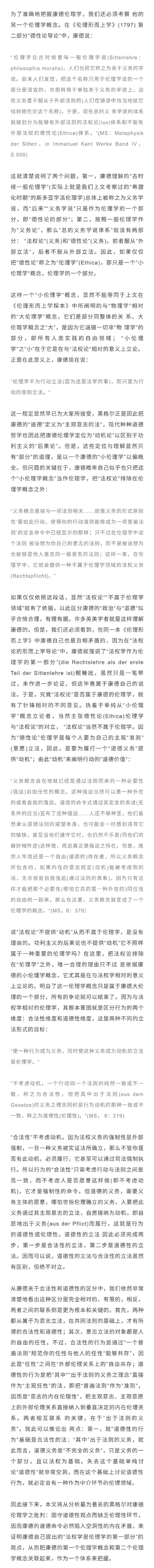 康德哲学中有两个伦理学概念,只要读过康德《伦理形而上学探本》(1785) (Grundlegung zur Metaphysik der Sitten,通常翻译为道德形而上学奠基/原理/探本”)和《伦理形而上学》(1797)(Meta-physikderSitten,通常翻译为道德形而上学”)这两本书的人,对此都应该注意到了。但是,实际上却并没有多少人真正清楚地认识到,康德这两个伦理学概念的区别以及它们之间的关系、张力和因此所引起的问题之所在。本文着力于区分这两个伦理学概念,并试图从概念史上阐明,康德的第一个伦理学概念,通过同物理学相区别,把自由的因果律自由法则”(Freiheitsgesetze)置于伦理学思想的中心,但又因其缘起于斯多亚学派而奠定了其义务论的本色,于是,自由的伦理如何同义务之必然的强制性和无条件的命令性这一矛盾相融,这一课题的解决就使得康德把近代作为道德科学的伦理学推进到了一个新的现代典范阶段(1);康德第二个伦理学概念,是更为精准化的伦理学学科概念,通过这个概念,康德把作为规范性科学的伦理学与同样是规范性科学的法权学区分开来,从而阐明了区别于亚里士多德古典德性论的现代德性论伦理体系。这一伦理学概念导致一个严重的问题是,德性论真的像现代英美的德性论学者规定的那样,必然与义务论对立吗?康德义务论的德性论,就不能被视为德性论伦理学吗?这是当代德性论伦理学出现之后迫切需要我们做出阐释的一个基础理论问题(2);就康德伦理学的内部理解而言,这两个伦理学概念也不是完全相融的,完全按照后一个伦理学概念理解康德,就会导致广为接受的黑格尔对康德的批评:完全局限于道德的观点,致使伦理的观点完全不能成立!如果按照第一个伦理学概念理解康德,那么,法权论作为外在自由之实现的伦理法则,必将成为其伦理学的一部分,同时实践的人类学这一伦理学的经验部分,也不得排除在康德伦理学之外,那么,康德伦理形而上学”(纯粹道德哲学)法权论”“德性论实践的人类学各部分之间的关系,必须在一个实践哲学体系中获得理解,这样,我们才能准确地把握康德伦理学及其意义(3)