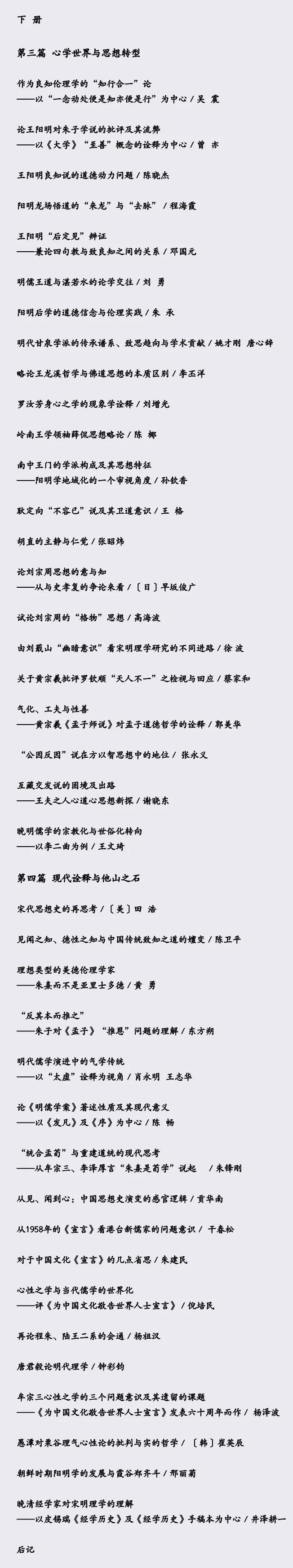 因此,我们有必要对朱子学和阳明学从更宽阔的视野做一番重新“定义”,尽管这项定义是描述性的,是对横跨宋明时代的朱子学和阳明学的思想现象的一种描述,而并不是从学科意义上,对朱子学和阳明学的学术概念的内涵和外延所做的明确界定。在我们看来,可以从不同角度来审视:从类型学的角度看,朱子学代表了理学形态,阳明学代表了心学形态;从学术史的角度看,那么事实上,无论是朱子理学还是阳明心学,应当都是宋明道学思潮的总体性产物;若从纵览全局的视野看,朱子学和阳明学无疑是宋明新儒学的两大理论高峰,在理论性质上,属于中国儒学传统中“重理主义”与“重心主义”的两种理论形态。