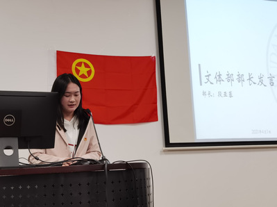 文体部部长段亚蓉同学首先对文体部的老成员们表示感谢并且欢迎新成员的加入。接着,段亚蓉同学进行了自我检讨,认为自己上学期分配任务时未能充分考虑到成员们的想法,因此本学期将做出调整,使部门成员在工作中发挥自主性。最后,段亚蓉同学希望大家可以在工作中实现共同成长。