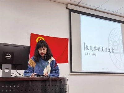 权益委副主任姚媛同学首先介绍了权益委的三大职能,接着介绍了自己主要负责的工作任务。随后,姚媛同学对于“权益委”部门提出了阐释,“权益”不是空洞的理念,更是工作中的实践。最后,姚媛同学提出了工作展望并承诺会全心全意为大家服务。