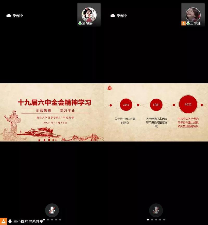 2021年11月26日晚,哲学学院2021级本科生班党支部联合党章学习小组在线上开展了十九届六中全会精神和党章党史学习。经过此次集中学习,同学们对于党的组织架构以及奋斗历程有了更加深刻的认识和理解。