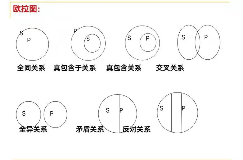 从逻辑的观点看,概念之间的关系是外延关系,不包括内涵之间的关系,它可分为相容关系和不相容关系。其中,相容关系可分为全同关系、真包含于关系、真包含关系和交叉关系。不相容关系,即全异关系,它又包括两种特殊的关系(即同一个属概念之下的全异关系):矛盾关系和反对关系。它们可以用欧拉图来表示: