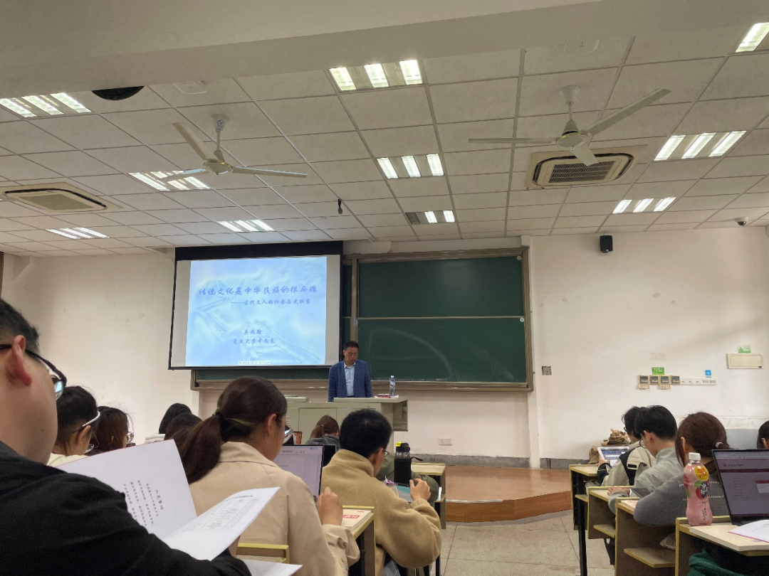 16点整,第一场理论学习讲座开始,主题是《传统文化是中华民族的根与魂——古代文人的社会历史担当》,由中文系教授吴兆路老师主讲。吴兆路老师首先强调传统文化的重要性,提出传统文化是中华民族的根与魂,是确保祖国茁壮成长的阳光,优秀传统文化体现着中华民族的文化基因,是中华民族共同精神家园的重要组成部分。之后,吴老师特别讲述了国学与传统文化之间的关系,国学是对中国传统文化与学术进行研究和阐释的一门学问,是中华文化的主要载体,强调文化对于一个国家的重要性,文化是第一创造力和第一生产力。最后,吴老师指出习近平在2016年“七·一”讲话中首次提出“四个自信”,要大力弘扬优秀传统文化,吴老师认为儒家思想文化最大的力量和意义在于修身、齐家、治国、平天下,号召青年们要把以天下为己任的范仲淹、“志士不忘沟壑”的李卓吾、“苟利国家生死以,岂因祸福避趋之”的林则徐等民族英雄作为榜样,学习张载“为天地立心,为生民立命,为往圣继绝学,为万世开太平”的使命感和历史担当。
