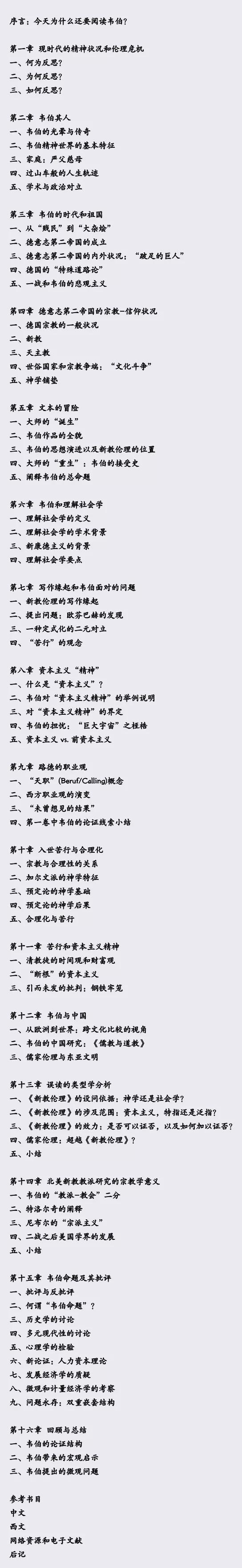 笔者认为“功夫在诗外”,无法顺畅理解该书的主要障碍并非原注的文本和文字,而是由于读者缺乏相应的文化背景和知识预备。为了克服上述的困难,笔者认为需要在以下几个方面进行着力:第一,本书花了大量的篇幅来建构韦伯新教伦理研究的文化史和作者的个人生活背景(第二-五章),以此来帮助读者了解韦伯进行新教伦理研究的学术史脉络以及他当时的主要问题意识。第二,要在经典文本和当代读者(尤其是当代中国大学生)之间建立起一座桥梁。新教伦理中对财富、职业的一些论述,对于当代人的生活无疑可以提供一定的反思对照。因此本书在导论(第一章)中突出于了“伦理”在韦伯那里的特殊含义以及当代人所处的伦理危机,并在行文中引入了一些贴近生活的案例来阐释韦伯的一些核心概念,例如合理主义等。第三,有必要突出韦伯的方法论基础。《新教伦理与资本主义精神》结合了韦伯的经济史案例研究和方法论反思。因此本书在第六章中概述了韦伯理解社会学的基本概念。不仅让读者看到韦伯说了什么,而且要让读者明白他为什么这么说,是如何得出这些结论的。第四,需要拓展韦伯在新教伦理中的论述,将视域拉回到亚洲和中国,加深读者的切身感。因此本书在第十二章中介绍了韦伯在《儒教与道教》中对中华文明的论述,以及二战后亚洲学者对其观念的质疑和反驳,以此来反思文化与社会的互动关系,从比较文化的立场来反观中华文化的特质。第五,要同时避免神话韦伯和对韦伯的误读。因此本书在第十三至十六章中特别总结了对韦伯命题的批评和汉语学界对韦伯新教伦理研究的典型误读,以及长期以来被忽视的新教教派研究之学术意义。第六,上述所有一切都必须基于对文本的直接和深度阅读。因此本书在第七到十一章重构韦伯论述的主要脉络和论证要点,正好对应《新教伦理与资本主义精神》的五章内容。第七,在全书有四个附录。第一个附录给出了对基督宗教的概述,来帮助中文读者领会该研究的欧洲历史背景;第二个附录给出了阅读《新教伦理与资本主义精神》各章节的指导性问题,可以让读者在阅读前就带着问题进入文本。第三个附录是对《新教伦理与资本主义精神》各章节内容和论证脉络的梳理,以防止在阅读中只见树木不见森林,错失了韦伯的论证主线。第四个附录给意犹未尽的读者推荐了一些扩展阅读书目,当然其中的评价都是笔者个人的主观判断。