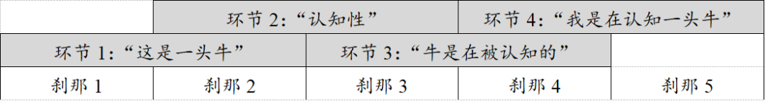 第一环节(刹那1和2)是原初知觉判断“这是一头牛”,“这”为被限定项,“牛”为限定项。第二环节(刹那2和3)是对第一认知行为本身的“认知性”(cognitionhood)进行直接把握的无分别现量。第三环节(刹那3和4)是第一统觉判断“牛是在被认知的”。在时间上,这一环节与第二环节有一刹那(刹那3)的互搭(overlap),而且在第一环节消逝的同时发生(刹那3紧跟刹那2)。故而它与前两环节都可有因果联系,第二环节的无分别现量便能提供“认知性”为其限定项,第一环节便能提供“牛”为其被限定项。第四环节(刹那4和5)是第二也是最终的统觉判断“我是在认知一头牛”。“自我”(ātman)为被限定项,自我在正理派是恒常的,在一切时刻均现实存在;“在认知一头牛”为限定项,它来自前一统觉。在前一统觉中,“认知性”与“牛”被结合起来,构成“在认知一头牛”,并给与最终的统觉。第一统觉与第二统觉也有一刹那互搭,可以有因果联系。