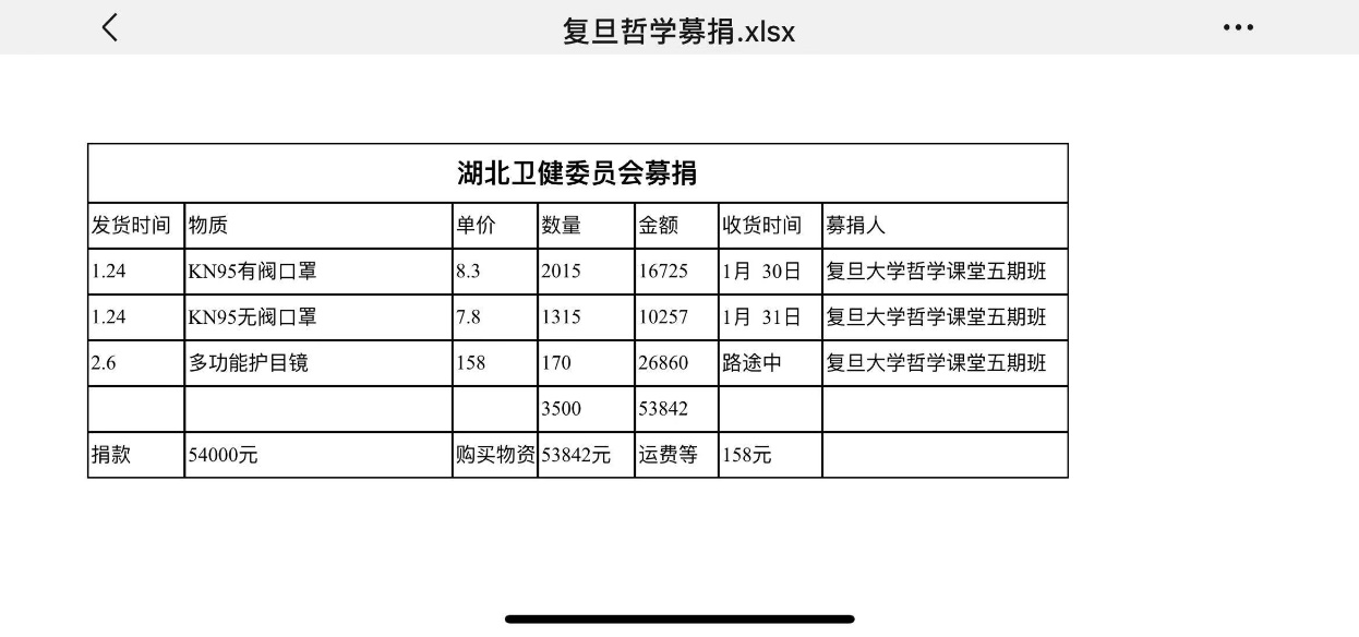 截止1月25日(大年初一),哲学五期师生(44位)共捐款人民币54,000元。全部款项购买物资分两批捐给湖北省卫健委,第一批物资:KN95口罩3330只(1月30日大年初六已经到达),第二批物资:护目镜170个(2月4日下单已发货,预计2月7日到达)。哲学六期师生(37位)从各自所交班费中捐出3342元,共计人民币123,560元。全部款项已购买两部分物资,第一部分:护目镜200只,100个已捐给湖北省黄冈市红十字会(2月3日签收)、100个已捐给复旦大学附属中山医院(2月5日签收);第二部分:澳洲产防护服800套,即将发给武汉同济医院、复旦大学附属中山医院。