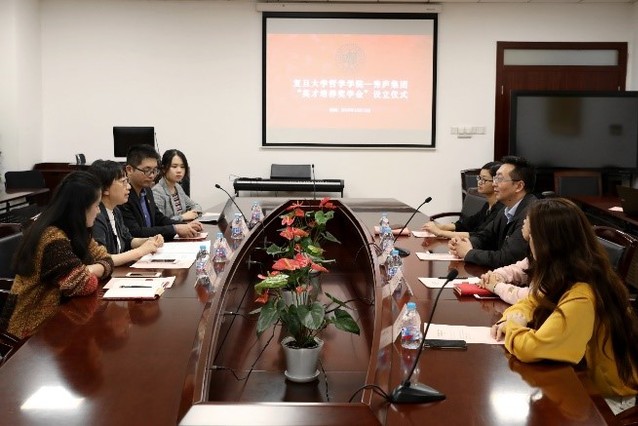 2018年10月12日,复旦大学哲学学院举办“英才培养奖学金”设立仪式。哲学学院党委副书记盛情老师、秀庐集团任生云副总经理、哲学学院研工组长赵琪老师、辅导员代表及学生代表出席了本次仪式。