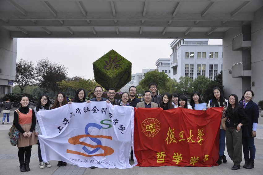 因为交流当天正值上海大学菊花节,上大校园内秋意盎然、满园飘香。交流会后,社科院的老师热情邀请哲院师生参观了校园,欢声笑语久久回荡。最后大家一同在正门合影留念,本次跨校交流会圆满结束。