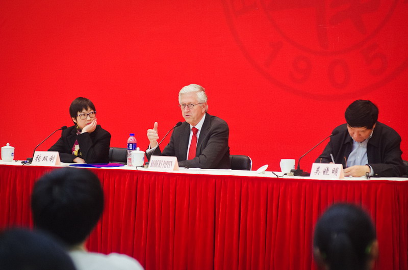 由复旦大学文科科研处主办、复旦大学哲学学院承办的复旦大学光华杰出人文学者系列讲座“德国哲学与现代性问题”的首场讲座于2013年11月13日在复旦大学顺利举行。本次系列讲座主讲人罗伯特·皮平(Robert B. Pippin)教授,现任美国芝加哥大学杰出教授、“社会思想委员会”主席、哲学系教授、美国艺术与科学院院士,是德国观念论、当代德国哲学、政治哲学、美学、伦理学、古典哲学等领域的国际著名学者。 首场讲座题目为“黑格尔论‘在思想中把握时代’”,由复旦大学哲学学院吴晓明教授主持,复旦大学哲学学院张双利副教授担任翻译。讲座吸引到了来自校内外的百余名师生前来旁听。 在本场讲座中,皮平教授着重讨论了个人对其历史时代的从属关系,并把这一关系看作现代自由的核心。他认为,黑格尔把理性看作社会历史的产物,同时也把社会历史看作理性实现的过程;他既拒绝了理性和政治的抽象化,又避免了对社会历史的浪漫主义理解。因此,哲学要考察个人及其相互关系,既不能单纯凭借某些“善的”法则,又不能单纯诉诸诗学,而是必须立足于个人所属的历史时代。而皮平教授正是通过深入分析黑格尔的代表作《精神现象学》,详细阐发了这种“在思想中把握时代”的哲学立场。 演讲结束后,吴晓明教授从马克思主义的立场对皮平教授的演讲做了精彩的点评。他高度肯定了黑格尔哲学对社会历史性的强调和对主观思想的批判,但同时质疑黑格尔式的和解只是一种纯思辨的产物,只是哲学家眼中的和解,却无法为普通群众所了解。在这一点上,黑格尔哲学背离了社会历史的实际过程,表现出了神秘主义的倾向。 点评结束后皮平教授针对吴晓明教授的点评同样进行了精彩的回应,并详细解答了在场听众提出的各类问题,令听者无不深受启发。 本次系列讲座将持续至11月19日,皮平教授在接下来的几天里还将进行四场专题讲座,从不同角度探讨“德国哲学与现代性问题”这一主题,相信将带给听讲者一系列难忘的学术体验。 (撰稿:张寅 编辑/摄影:于明志)